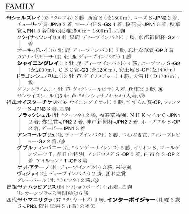 近親にブラックシェル(福寿草特別)やインターボイジャー(札幌3歳S)など。